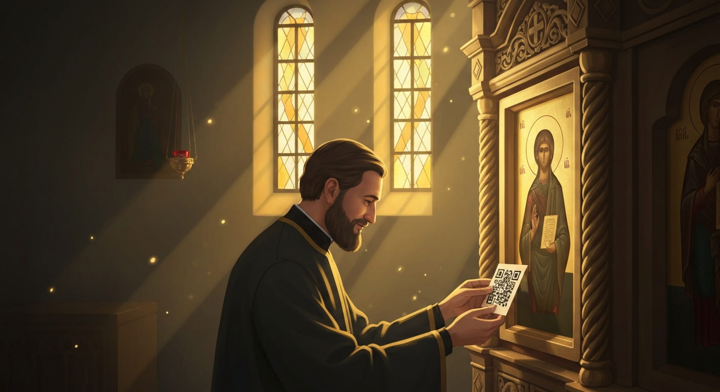 Поднесите телефон к NFC-метке или отсканируйте QR-код у иконы в храме — откроется текст молитвы святому. Без приложений и регистрации.